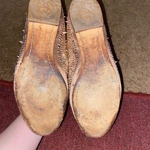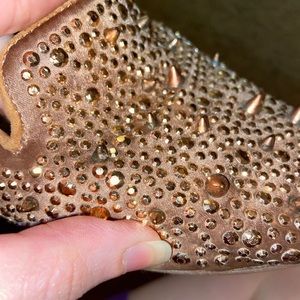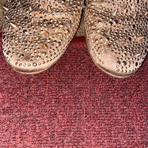 Preowned Sam Edelman loafers with flaws. There are some rhinestones missing from the front and some tarnish on the studs. Also there’s a stain on the inside of one them. Rose gold color and size 6.