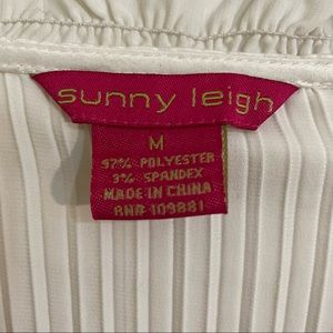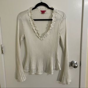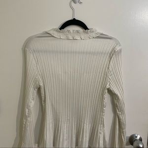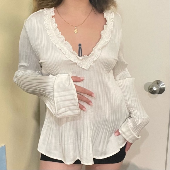 White silky top with bell sleeves and ruffles on the neckline. Deep v neck! Absolutely stunning and super flattering. I *deeply* regret that it doesn’t fit me properly! Very light weight and flowy.