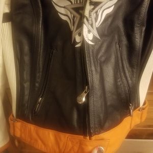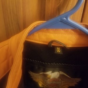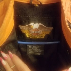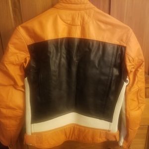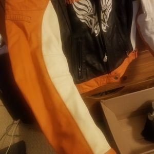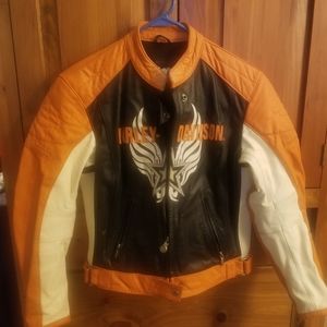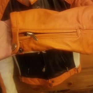 vintage women's harley Davidson's leather jacket size small. orange and white in excellent condition no tips no stains. just too small. padded in places to secure protection.