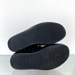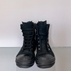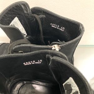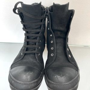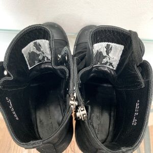 This Rare model of the classic Ramones has become one of my favorites since I first bought them especially with the growing popularity. You can have the same Classic ramones aesthetic while subtlety stepping it up from the regular Ramones. upper is made from reversed suede calf leather hand burnished for the weathered blistered look. Black leather on black shark-tooth rubber midsoles. Insole is leather. Side zipper detail with suede lining. Really rare iteration from my personal archive/ collection doesn’t fit anymore. Regular wear heel drag and wear in toe caps can be repaired by cobbler. Both laces included I just always wore them without.
