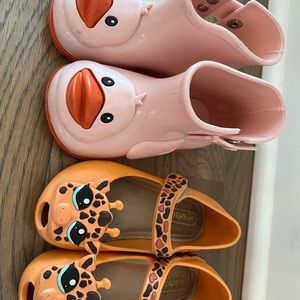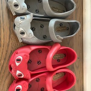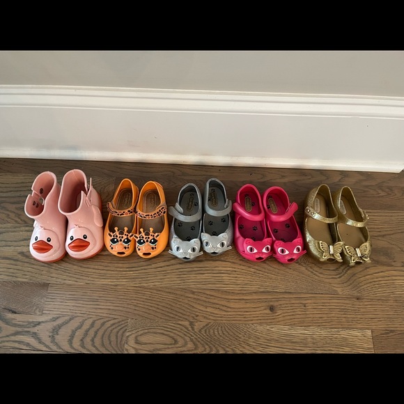 Five pair of darling Mini Melissa girls shoes in size 7. My daughter took good care of them, though a good clean up and magic eraser would do them good.