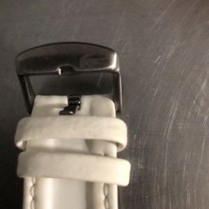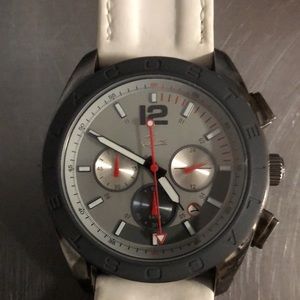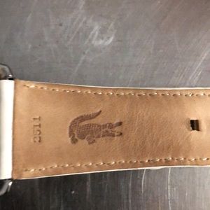 Unisex watch with enough notches to fit 7.5 inches at its widest, to five inches at its smallest. This watch highlights prominent rubberized Lacoste face band, white enamel hour and minute hands, with red enameled second arm. No box or dustbag, and setting the time is easy.