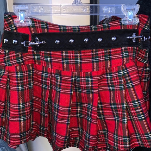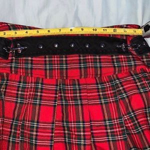 Super cute red plaid tartan skirt with a studded belt/buckle detail in the front (M)
