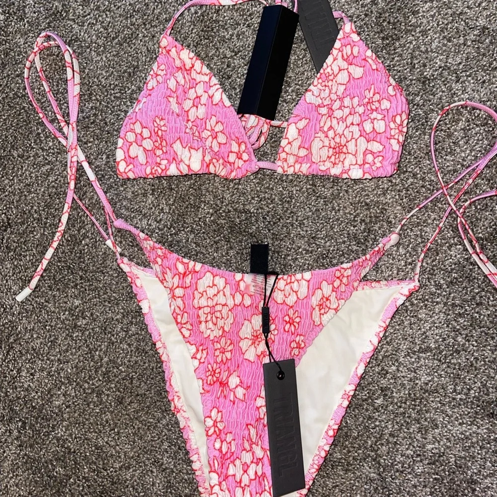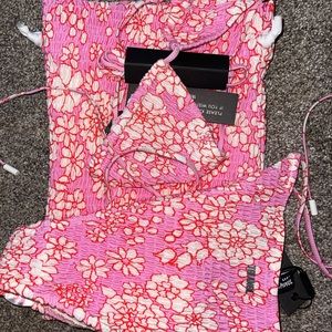 I’d say the top fits more like an xs/s and the bottoms fit more like a medium. I bought those sizes knowing they would be smaller but it still isn’t for my body type. Comes with bag.