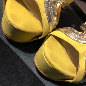 Ladies gently used yellow/gold platform heel with back zipper (scratch on front of both shoes). Minor wear noticed but a lot of wear left in these cuties