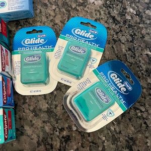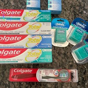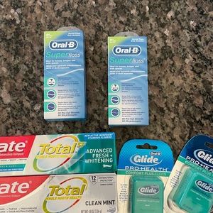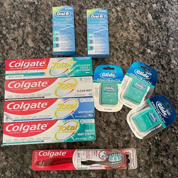 4 toothpaste, 3 floss, 2 super floss 50 count, 1 toothbrush dental bundle! all unused/unopened colgate and oral b