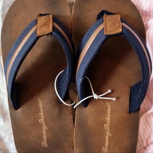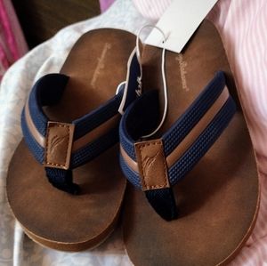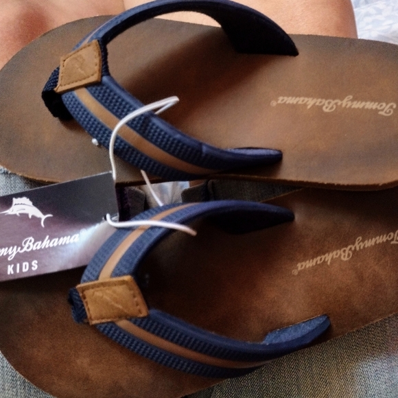 Boys size 1-2 (L) Tommy Bahama kids flip-flops. Never used. Brand New With Tags, however, I do not have the box. Brown sole with blue straps & brown stripe. They're super light - perfect for the beach! Feel free to reach out with any questions! Smoke free & pet free home.