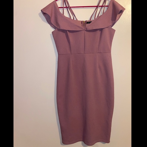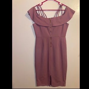 Beautiful dark pastel pink dress. On shoulder/off shoulder, material is great some what stretchy to perfectly hug curves. Below the knee. Worn twice, good conditions! Exposed zipper on the back and small slit in the back for leg exposure, great for only occasion.