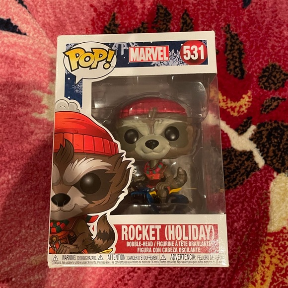Rocket Holiday Funko Pop. Only ever displayed on a shelf. Never taken out of box. Price is firm, thanks!