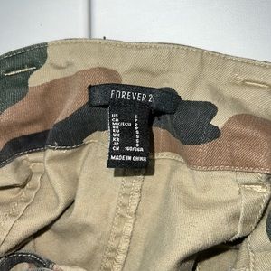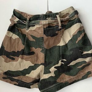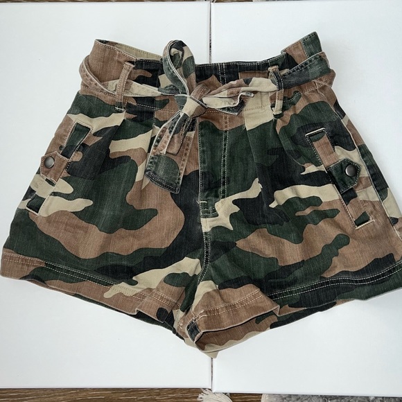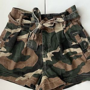 Never worn paper bag shorts from Forever21. Camouflage. Really flattering. Comes with belt that ties in the front. Pockets with snaps to keep them closed. In amazing condition, have just sat in my closet. Size Small