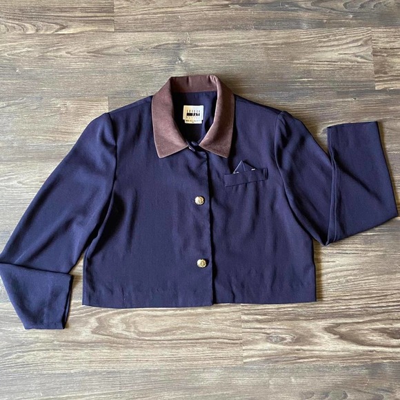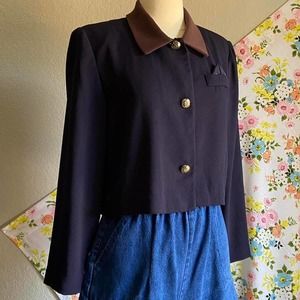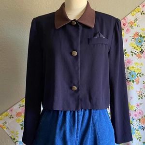 VINTAGE 80S 90S CROPPED NAVY BLUE BUTTON UP LONG SLEEVE TOP / CARDIGAN size 12 P (petite)