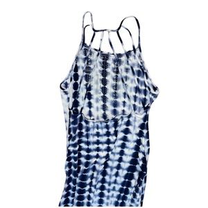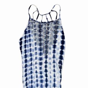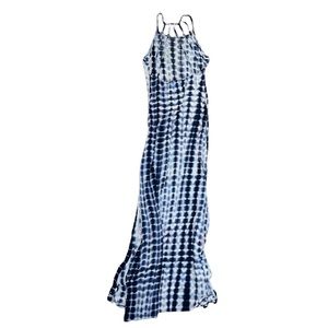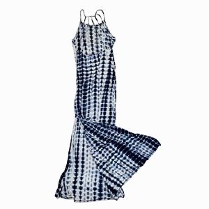 Beautiful strappy maxi dress from Express! It has almost a dip dye blue and white design and straps showing the exposed back. Slit in the skirt as well and arranged sequins in the front for extra detail. This dress looks so amazing on and is perfect for holiday.