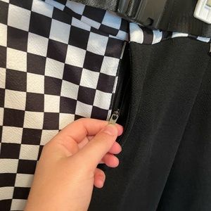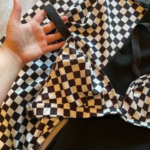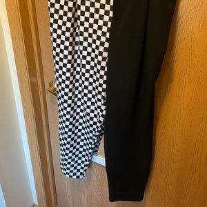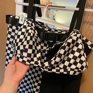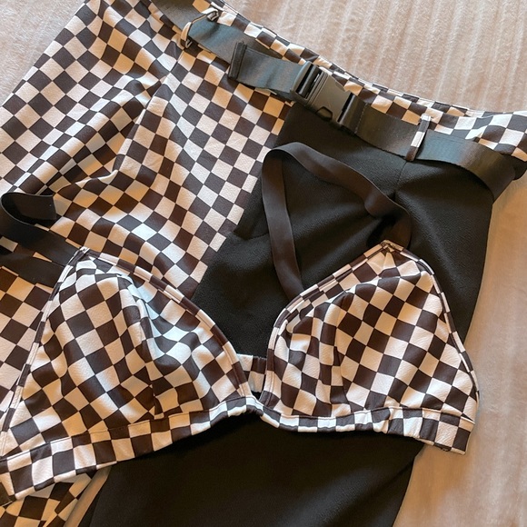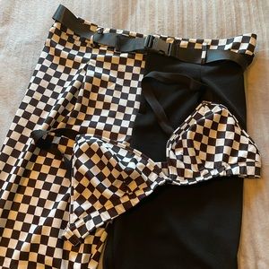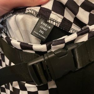 Shein brand, black and checkered set. Long pants, checkered shirt/bra, buckle belt. Bought this for a costume but it didn’t work out. 3x shein curve size. Polyester feeling fabric