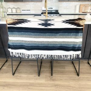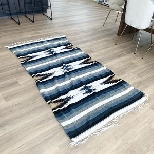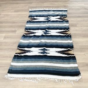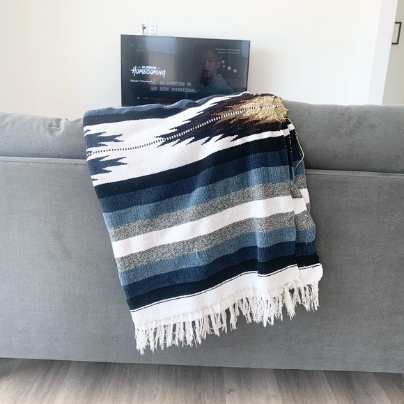 Blue and grays blanket, with white ruffles on side