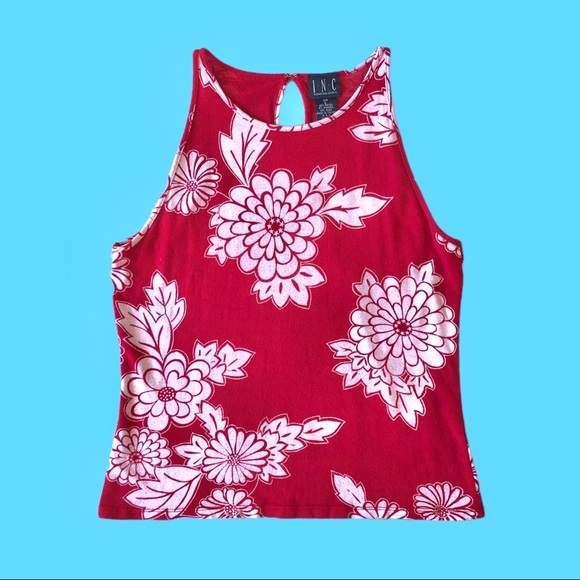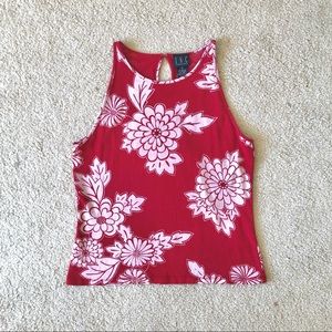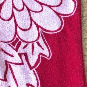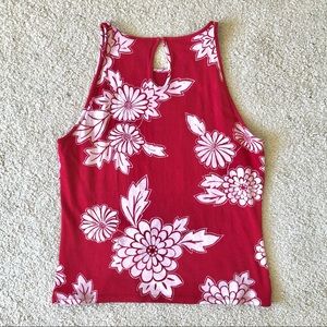 Red sleeveless tank with big Hawaiian flower print. Has a little peephole in the back with a hook and eye closure. Has some all over pilling & fade, as well as a teeny tiny snag hole on the left side (see last photo). This too is SO comfy. Has some stretch.