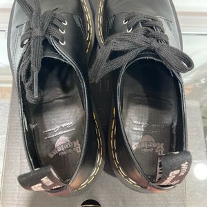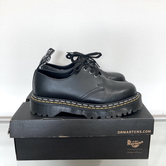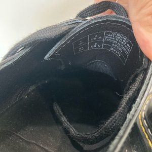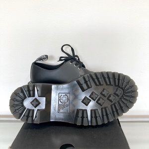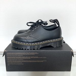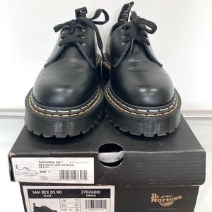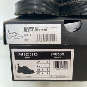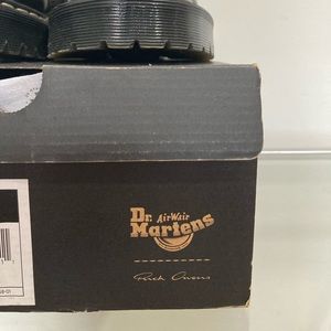 Dr. Martens and Rick Owens have championed a spirit of subversion and defiance that is on full display in this counter-cultural classic 1461 Bex shoe. Our Original 3-eye shoe stands a little taller and looks a little bolder with the Rick Owens touch. The 1461 Bex DS RO is made with Black Smooth leather and is stacked on a Smoke Bex sole, finished with a distinctive yellow and 'Pearl’ double welt stitch. The shoe is also debossed with Owens’ ‘DEEPER THAN A MOTHERS TEARS’ motif.