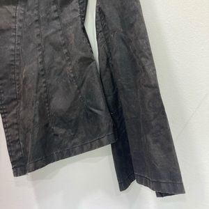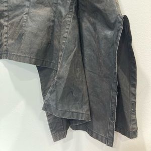 Yohji Yamamoto redesigns the classsic moto jacket. Shedding all hardware and closures to opt for a more natural look. The jacket is made from naturally dyed cotton in dark brown/ olive color finished with wax coating for a beautiful washer and textured look. Elongated and draping arm sleeves and waist flow of the side of the cropped fit.
