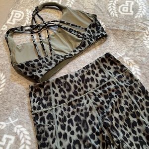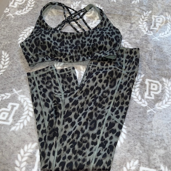 Green and black army print 2 piece workout set from Victoria Secret. Stretch material, sports bra is size large and cross crosses in the back. The pants are high waisted, stretchy, size 10 and have pockets on side and back. 3/4 length pants. Gold VS wording on back of both. Great shape!