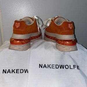 Naked Wolfe Virgo platform sneaker in orange. US 7 EU 37. Really sad to be listing these but I have to accept that they are a TAD too narrow for my feet so I can’t appreciate them as much as I want to. I would say true to a size 7 if you have narrow or standard toes. Could fit a wide size 6.5 . Lightly worn, no noticeable stretches on suede. No box but both dust bags are included. Ribbon shoe laces AND original terry laces are included.