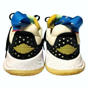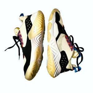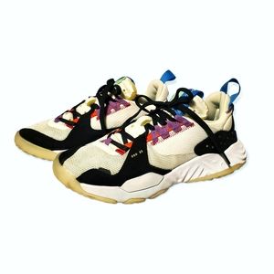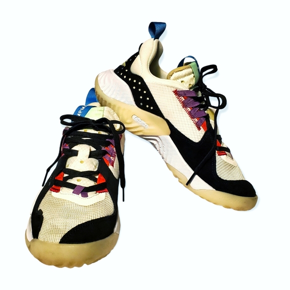 The women's Jordan Delta SP multi-color applies vibrant accents to an otherwise neutral build, highlighted by an off-white mesh upper with contrasting black suede overlay. An exposed foam tongue and padded collar work in tandem to deliver a comfortable fit, and the webbing pull tabs in bright blue finish provide easy on and off. The retro lifestyle silhouette rides on a responsive reactive foam midsole and is supported underfoot by a herringbone gum rubber outsole.