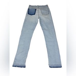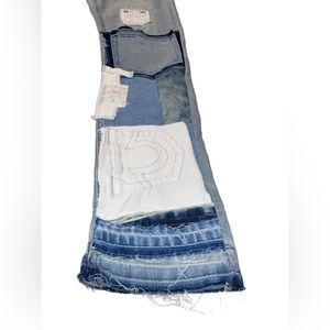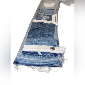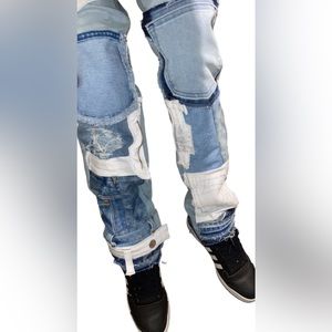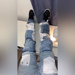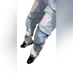 1of1 custom patchwork light blue slim jeans with Levi’s , true religion & many more pieces. Spent over 10 hrs on creating this unique piece. Size 32x34 I went w the 34 length for more of a stacked look for those who normally wear a 32 length it’s a style. Slim jeans but got that nice loose fit , very light jeans for a nice comfortable fit. You will break necks and even get compliments.