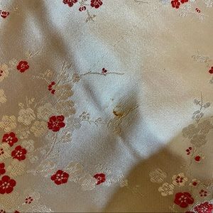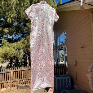 gorgeous vintage 80s baby pink qipao with floral detailing, cap sleeves, slits on both sides, and traditional buttons! It is in great condition with a few pulls in the fabric and small stains as shown in 4th pic, but the material feels very high quality. Hope this can be passed on to someone who will love it very much :)