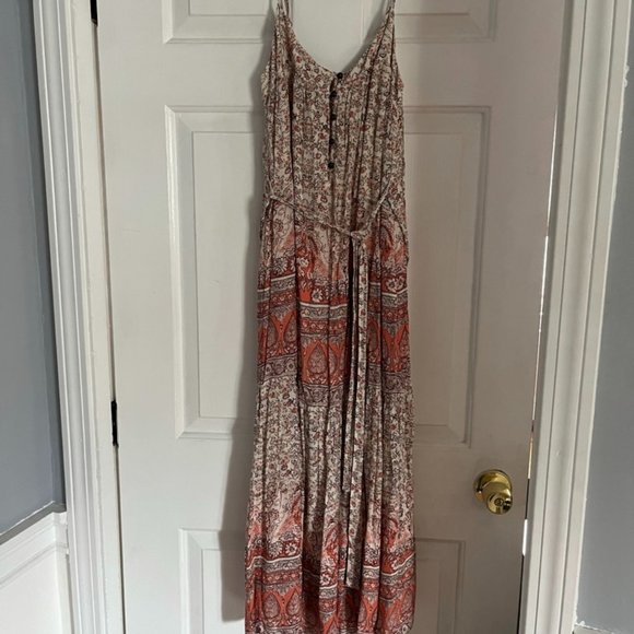LOVE this dress! But only wore it once! Long, flowing LUCKY dress. Perfect with a sweater and boots for the Fall or sandals in the summer or spring!