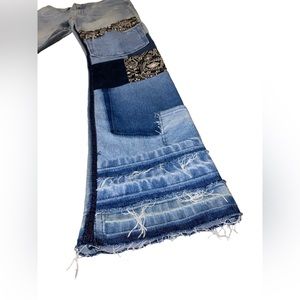 1of1 custom patchwork jeans with middle finger patches on the back left leg size 29x32