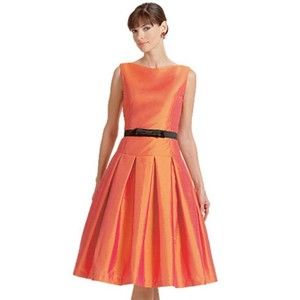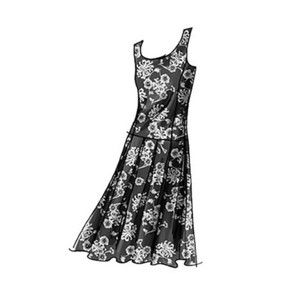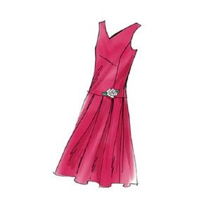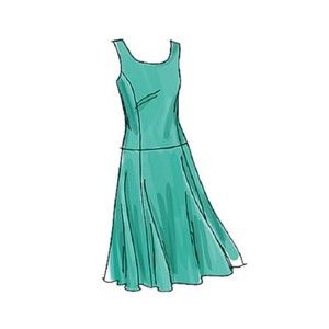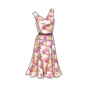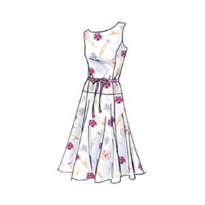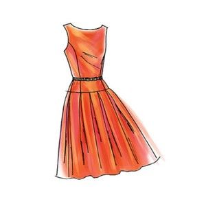 Flared, unlined dress, below mid-knee has semi-fitted, below waist bodice, princess seams, neckline variations, side zipper and pleated or gored skirt. A, C: contrast belt with bow. B: purchased ribbon belt. D: purchased flower.
