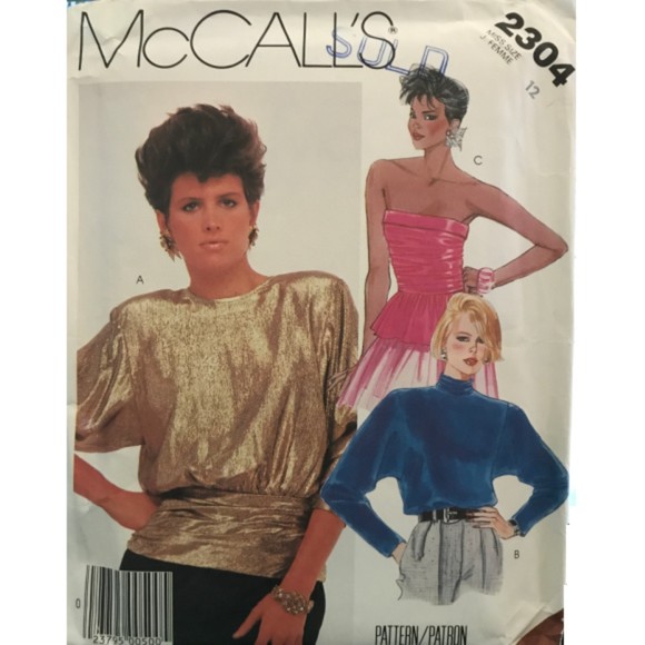 Misses' tops. Blouson pullover top (A) with long tapered sleeves, shoulder pads and back neck opening has faced bias hip band with hook and eye left side placket closure. Pullover top (B) has shoulders pads, back neck opening, faced bias collar with back gathers and back opening and long tapered sleeves. Bustier C, cut bias, is gathered to stay (underbodice), has bias upper band, boning in side seams, gathered peplum and left side placket closure with hooks and eyes
