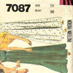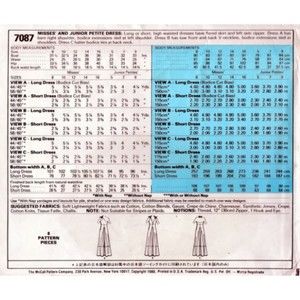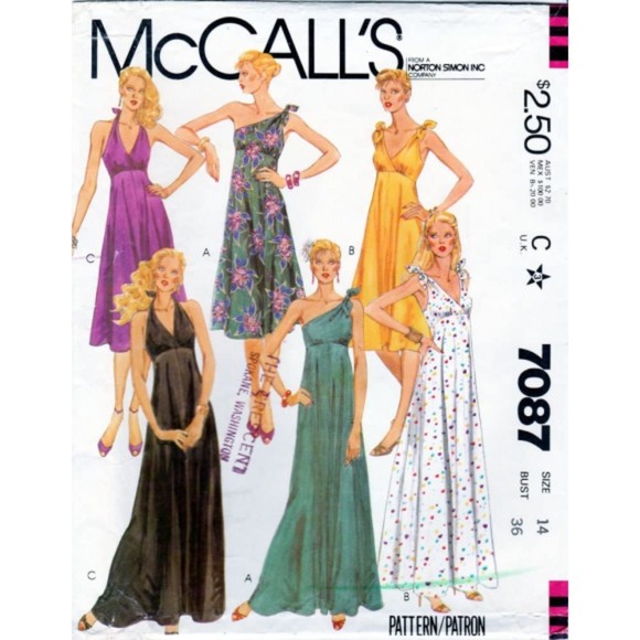 McCall's 7087; 1980; Misses' and Junior Petite Dress: Long or short, high waisted dresses have flared skirt and left side zipper. Dress A has bare right shoulder, bodice extensions tie at left shoulder. Dress B has low front and back V-neckline, bodice extensions tied at shoulders. Dress C halter bodice ties at back neck.