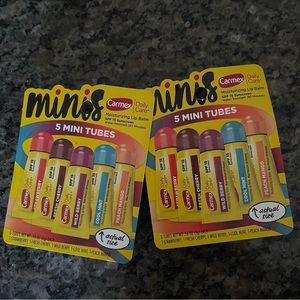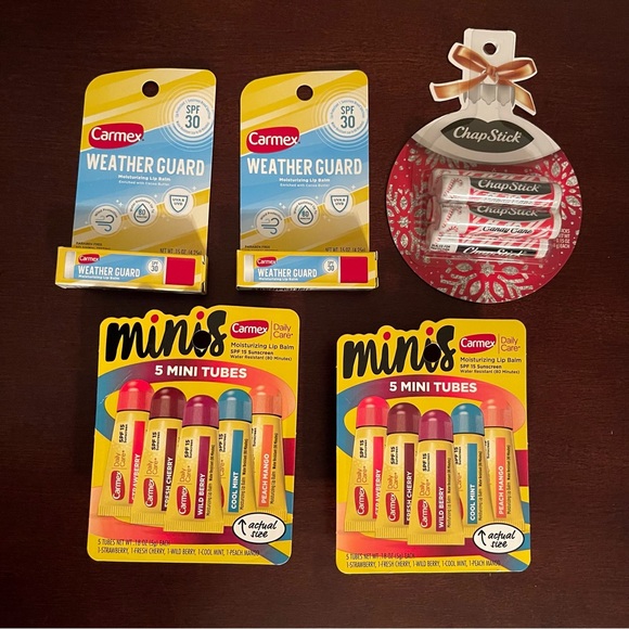 5 sticks chapstick candycane, 2 sticks carmex weatherguard spf30, 10 tubes of carmex minis multi flavors
