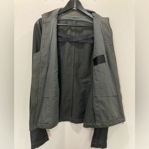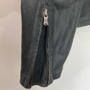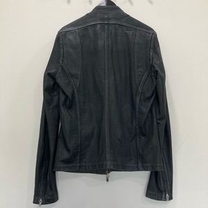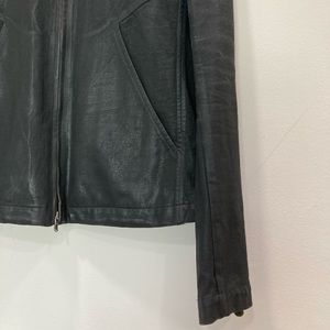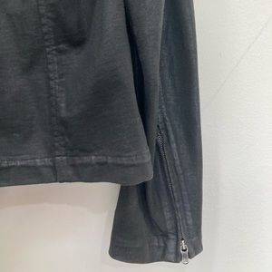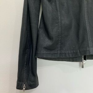 Japanese Label and staple The Viridi Anne absolutely hit the mark on this Biker style jacket. Features slim fit and stretched arm length for slouchy oversized look. Made from light denim/ canvas material with wax coating. Two side pockets and two interior pockets as well.