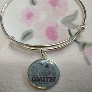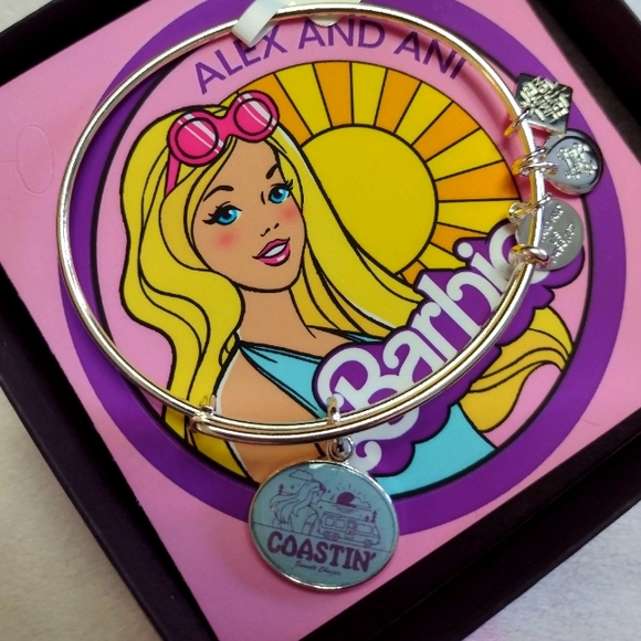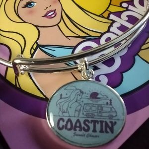 Bring on the sunshine and good vibes with this Malibu Barbie Charm Bangle! Features a blue circle charm with Barbie looking out a picturesque sunset and RV, above the mantras 'coastin'' and 'sunset chaser'.