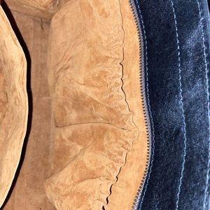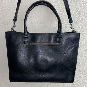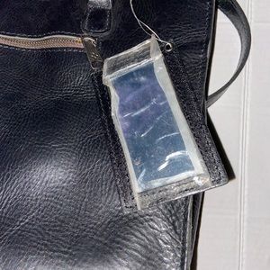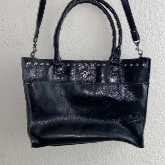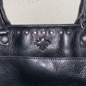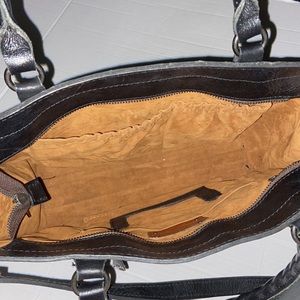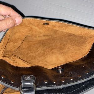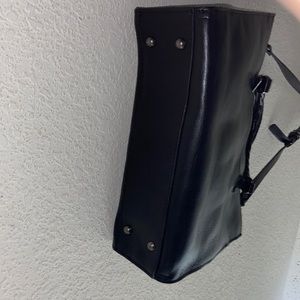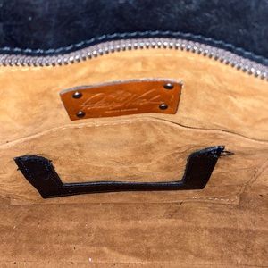 Black 100% Italian Leather. 2 twill hand straps. Bronze hardware and studs. Adjustable shoulder strap. Comes with a hand mirror. Snap closure front pocket. Full zip and back zip pocket. Chestnut suede textured interior. Interior has some minor stains and usage. Great durable made bag. EUC 8/10.