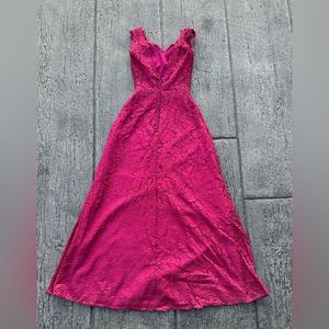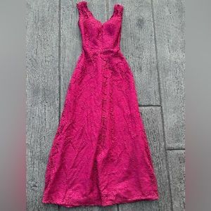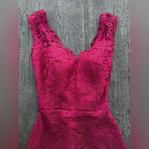 Very cute deep plum colored lace dress. I wore this as a bridesmaid but I feel like it would work for prom. In great condition, only worn once. This was altered to about a size 2 -4. My height is 5 foot 3 and we altered it to be able to touch the ground with 3 inch heels. Feel free to ask any questions or make offers!