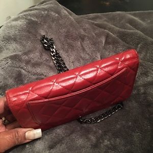 Authentic 06-08 Vintage Chanel Quilted cc Lambskin Matelasse Flap wallet in Brick Red color. Please note: this wallet is pre owned and has been reconditioned by professional, some areas have slight dark discoloration but not noticeable (pic), Silver hardware, zip coin pocket has staining from coins (pic), 8 cc slots, exterior is good has slight shine no tearing some normal creasing across the top side (pic).