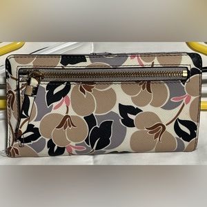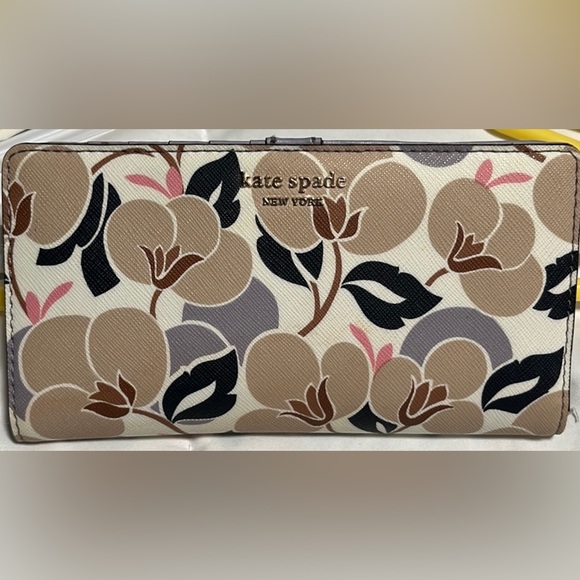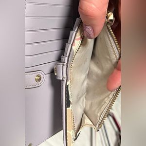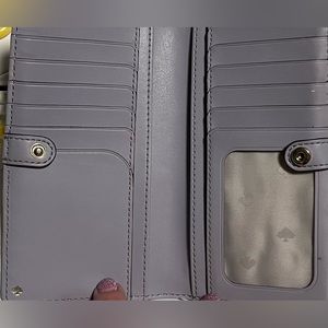 Super cute Kate Spade wallet. Has a floral design on the outside with a super pretty lilac color on the inside. The back has a zipper pocket for change. Button and zipper both work.