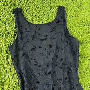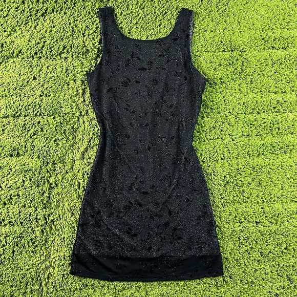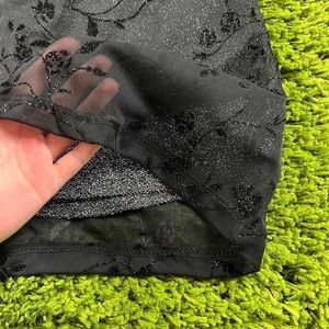 The ultimate vintage 90’s dress, has a silvery glittery under layer and semi sheer mesh overlayer with a floral pattern, mesh layer extends a bit past the under glitter layer!