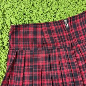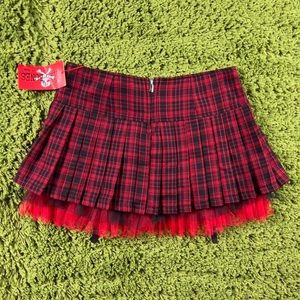 Deadstock new red and black pleated plaid mini skirt with tulle under layers and attached garter straps at the front