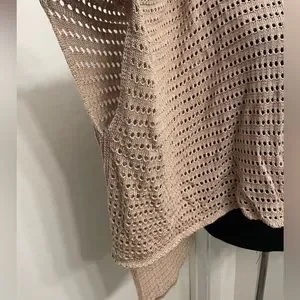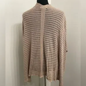 open front poncho? (🤔not sure what to call it😬) with arm holes Tan with colorful sparkly threads running through. It’s like a combination of a poncho, a cardigan, and a kaftan. It’s loose and kind of draped like a poncho, but it has armholes like a kaftan, and it’s open in front like a cardigan! The color with the sparkle and the fit give it a loose, boho vibe.