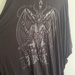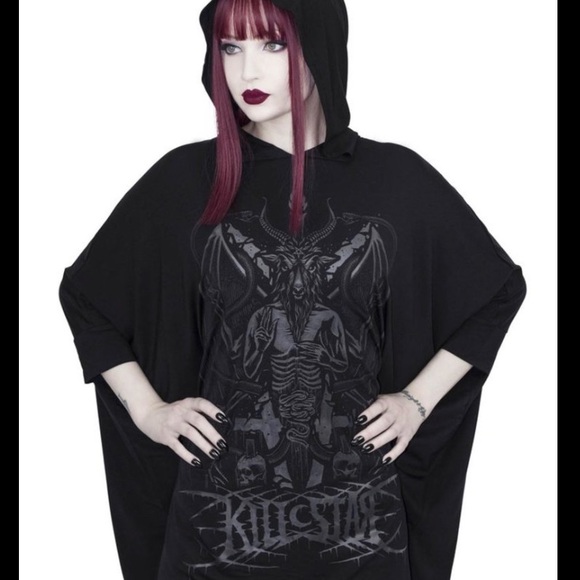 Insanely comfy- so much room- designed for an oversized fit. Large hoodie with Baphomet front print and “killstar” in metal lettering across bottom. Dolman style sleeves, asymmetrical hem.