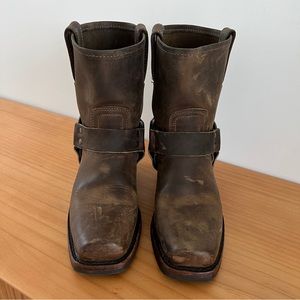 Great condition women’s size 5.5 Frye Harness 8R brown leather boots! Gently worn with some scuffing as intended for this material; will look beautifully worn over time. Rubber soles in excellent condition, only worn a couple times. Metal harness detail on inner and outer boot.