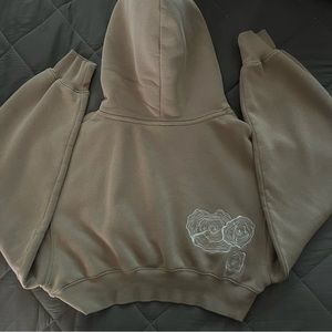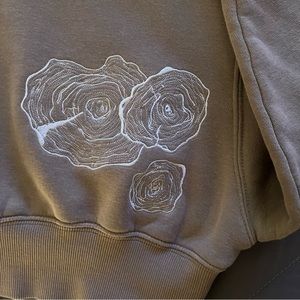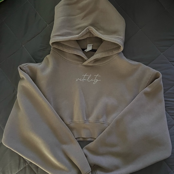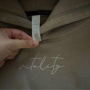 Balance Athletica / Vitality: The Affirmation Hood in beige. This hoodie is cropped and lands above the waist/hip on me, I am 5 feet 2 in. for reference.