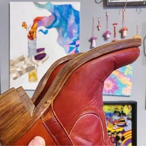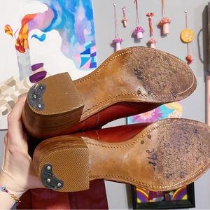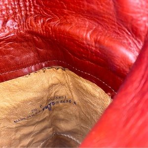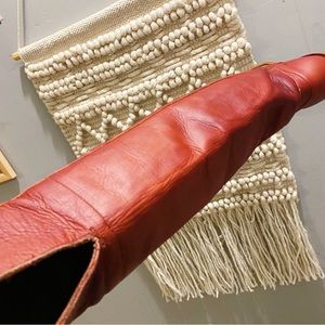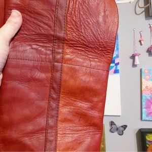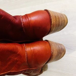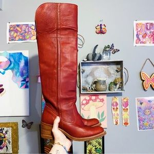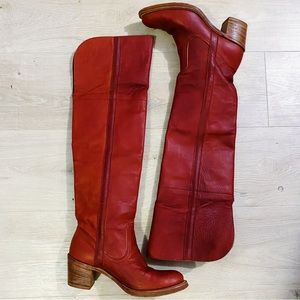 Vintage Frye red leather over the knee boots. Has some minor wear (view photos). Otherwise excellent condition. Recently treated with mink oil. Size 7.5 TTS. Approx 2.5” heel. Height of the boot from top of the heel to top of the boot is approx 21”
