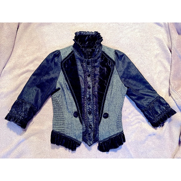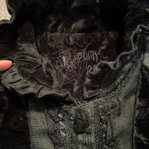 PunkRave brand blouse/coat! I got some use out of this back when it suited my style, but it’s been sitting in my closet for too long. Gorgeous piece! Large functional cloth buttons, w lace and velvet detailing. Fully lined inside. 3/4 sleeves w a high flared collar.