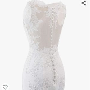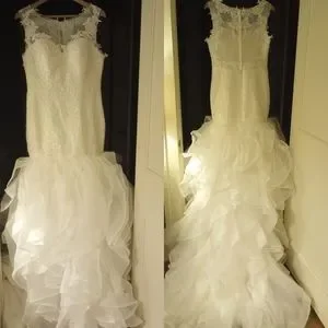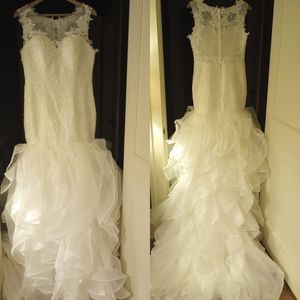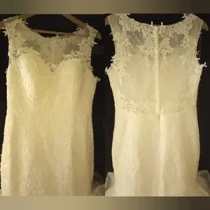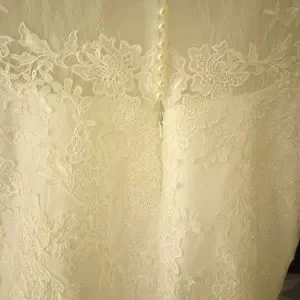 I'm selling this beautiful wedding dress, brand new, only tried on, perfect condition but I've lost weight and I'm a few months away from my wedding date. See size in pictures. zip and button closure. Will fit a size 12 or a size 10 with adjustments. Not taken in the best lighting but dress is Ivory.