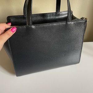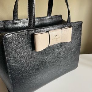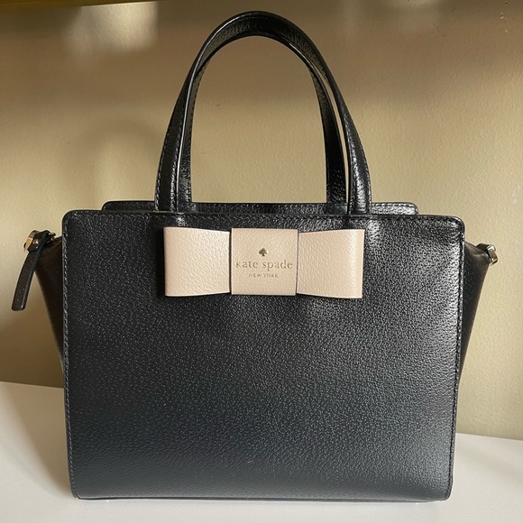This is such a cute and pretty bag. I love the bow on the front and how much this bag can really hold! It’s structured and comes with the crossbody strap. It’s in very good condition with the only signs of wear being a slight crease in the front, as shown in the second photo, and on the bottom feet. Otherwise the inside is clean and it’s still very beautiful! Please let me know if you have any questions :)