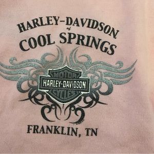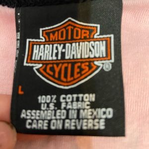 Harley Davidson baby pink and black women’s baseball t-shirt size large! supperrrrr comfy and stretchy, tagged a large but can fit an XL! In perfect condition but a warning the glitter on the front decal does come off a teensy bit!