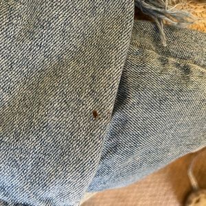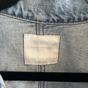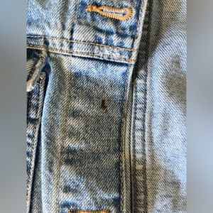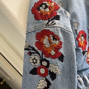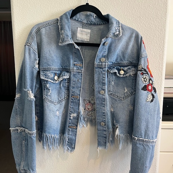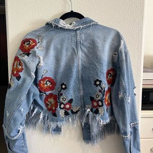Such a statement piece. Very cute and adds such a pop to a basic ripped jean jacket. Can be worn at any occasion. Slightly oversized but cropped. Has two very small stains as pictured. One on the strip in between the button holes and one on the left sleeve. Other than that, this jacket is in great condition
